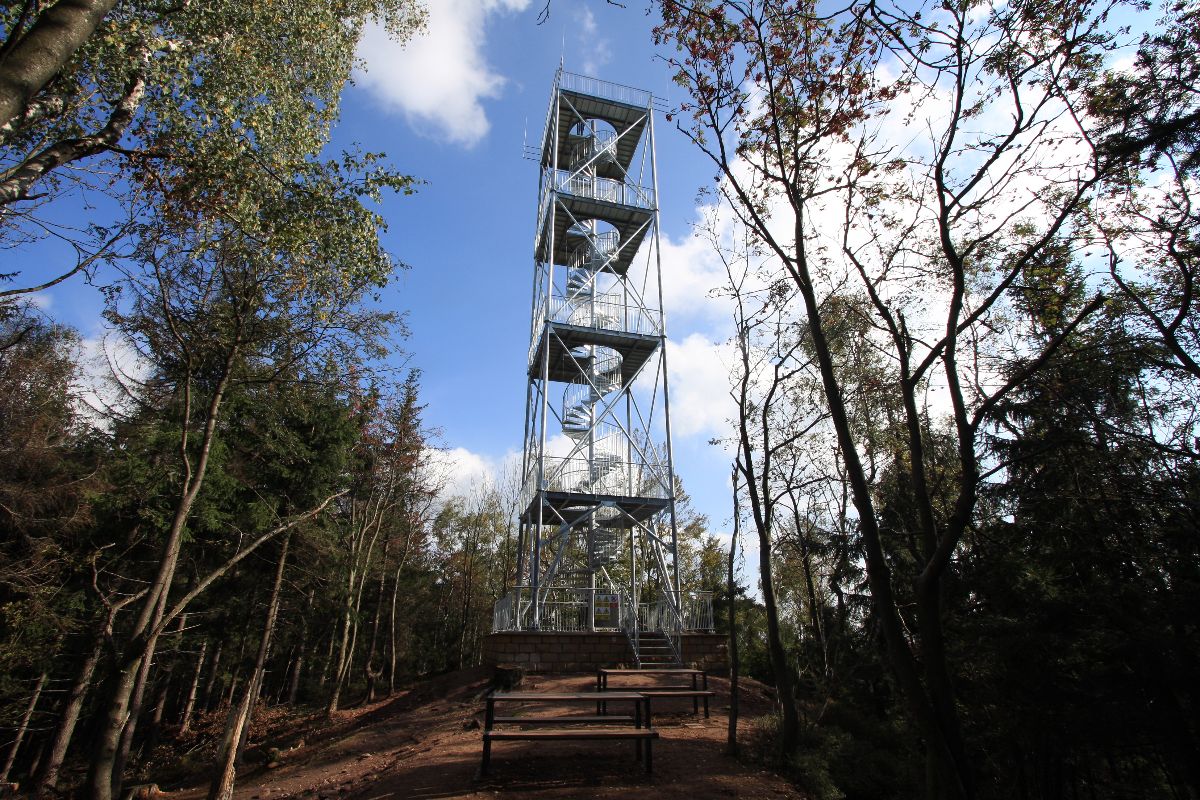 V místě rozhledny vzniklo odpočinkové místo se stoly a lavicemi.